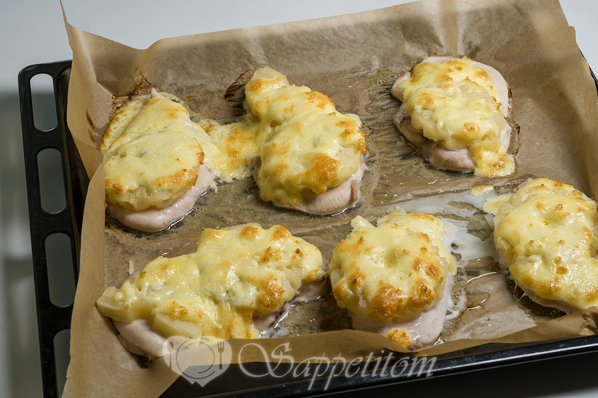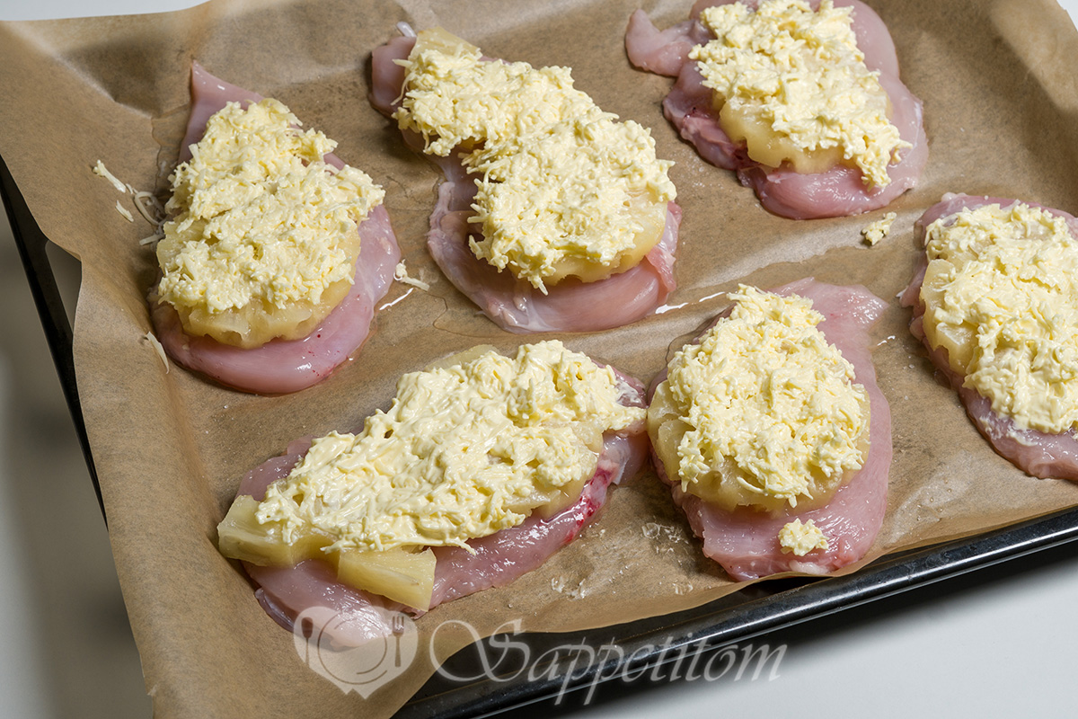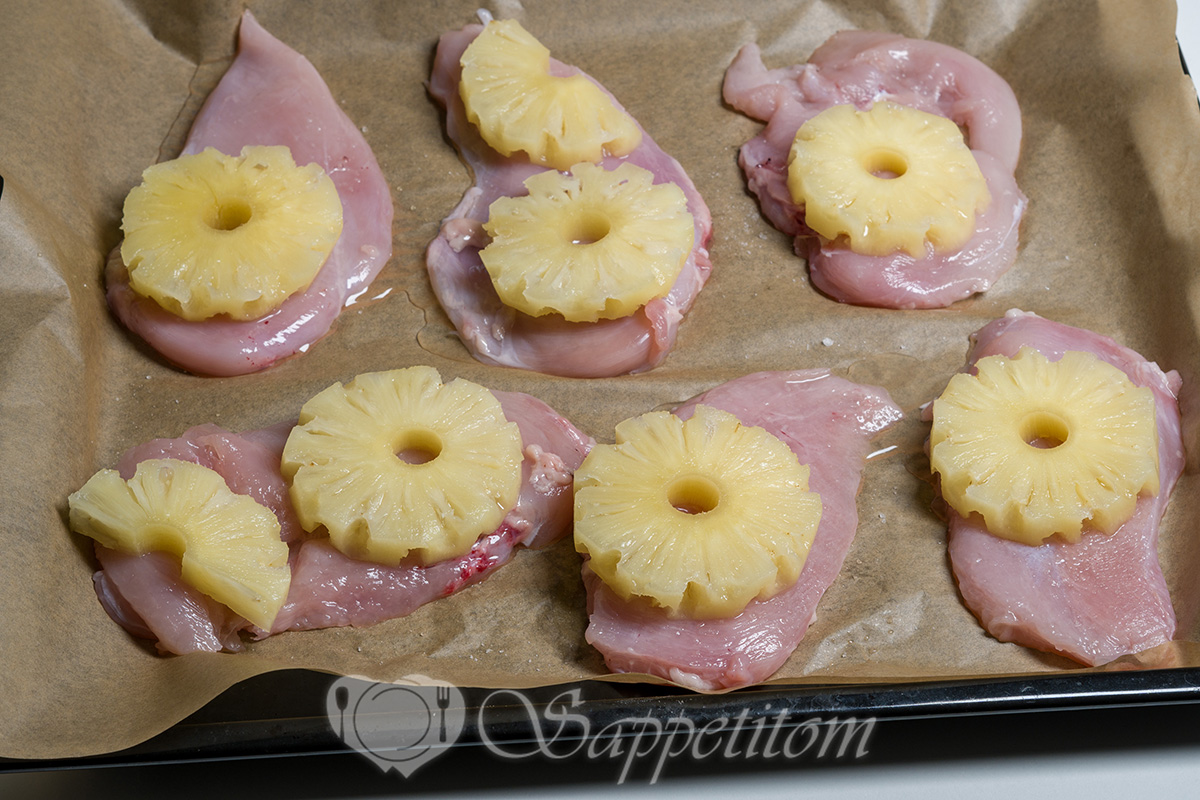 Ананасы выкладываем сверху, чтобы курица почувствовала себя на курорте. "Я не запекаюсь – я загораю!" – думает она.
