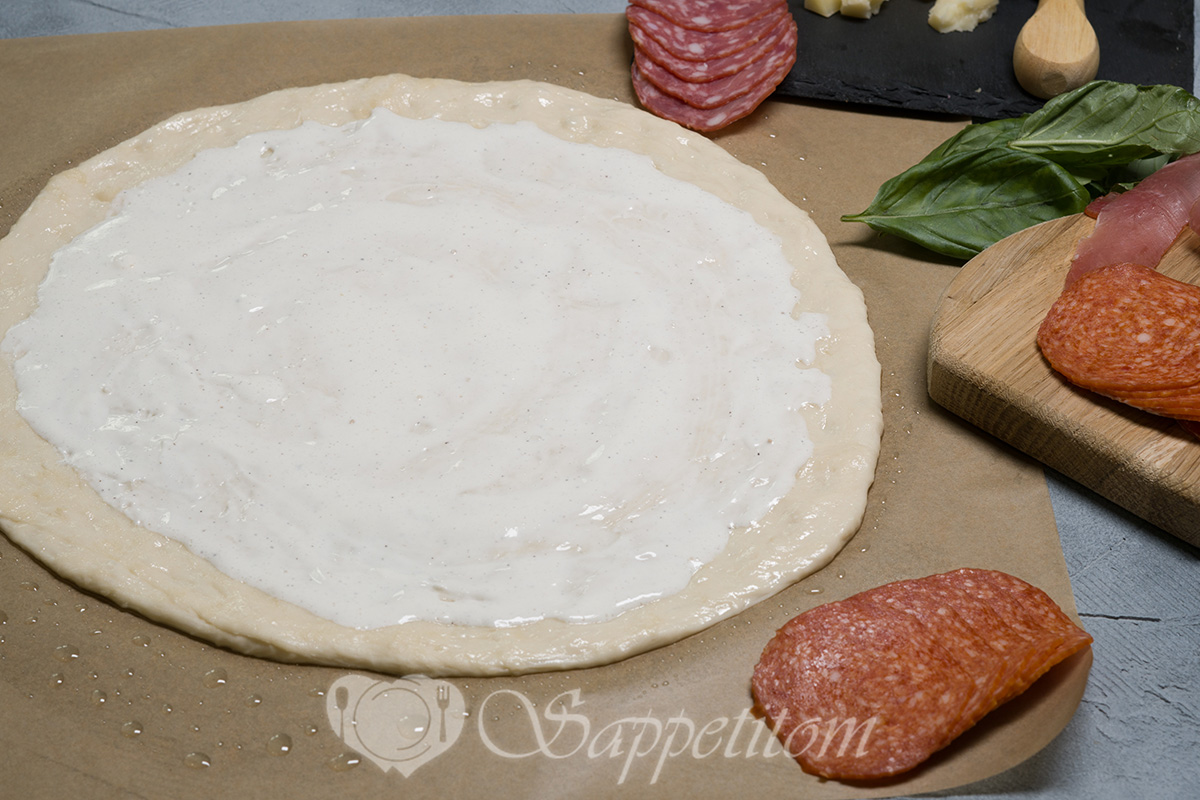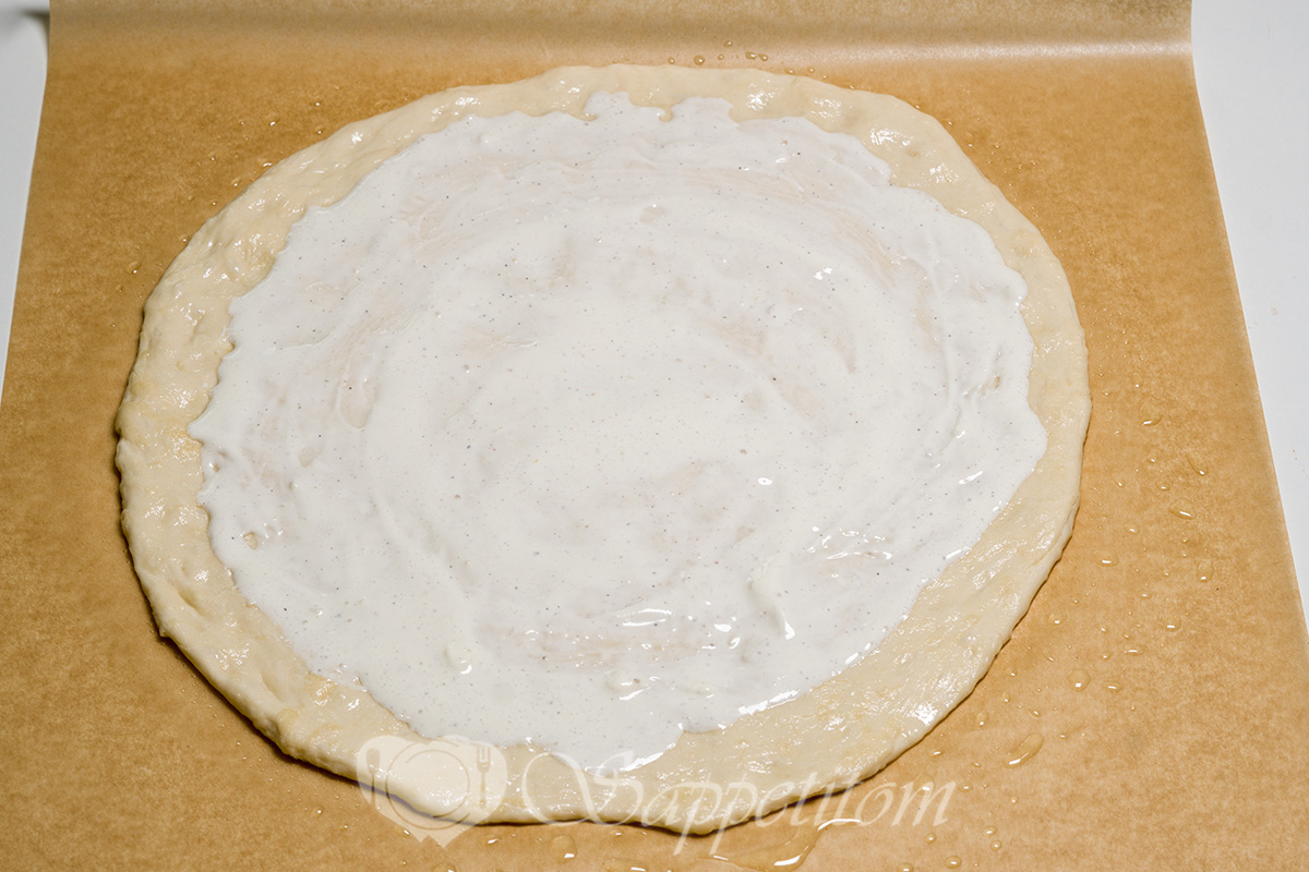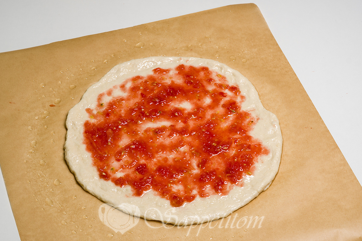Сколько соуса класть на пиццу? На основу диаметром 30 см — 3–4 ст. л. Распределяйте ложкой от центра к краям, оставляя 1,5 см без соуса.